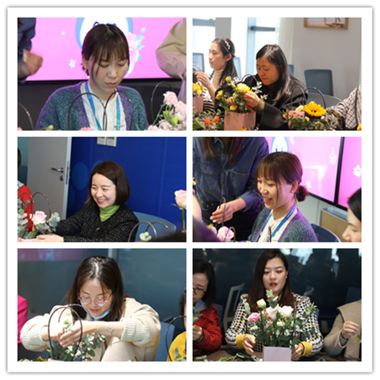 “待到山花爛漫時,她在叢中笑”,步入精心布置的會議室內,芬芳拂面,花團錦簇,形色各異,溫柔了心境,也溫柔了纖纖細指,褪下平日的繁忙,女士們靜至一角,時而折枝,時而塑形,高高低低,深深淺淺,有歲月的感觸,也有時光的顏色,手中的是屬于自己的獨一無二的美好藝術——插花的原趣,也就變得生意盎然,整個會議室已不再如往日的單調,而如這三月的鮮花,如各自手上的花籃,有姿有態(tài),搖曳生輝,女神們塑造著屬于自己的美,也塑造著屬于自己的美好人生和幸福生活!